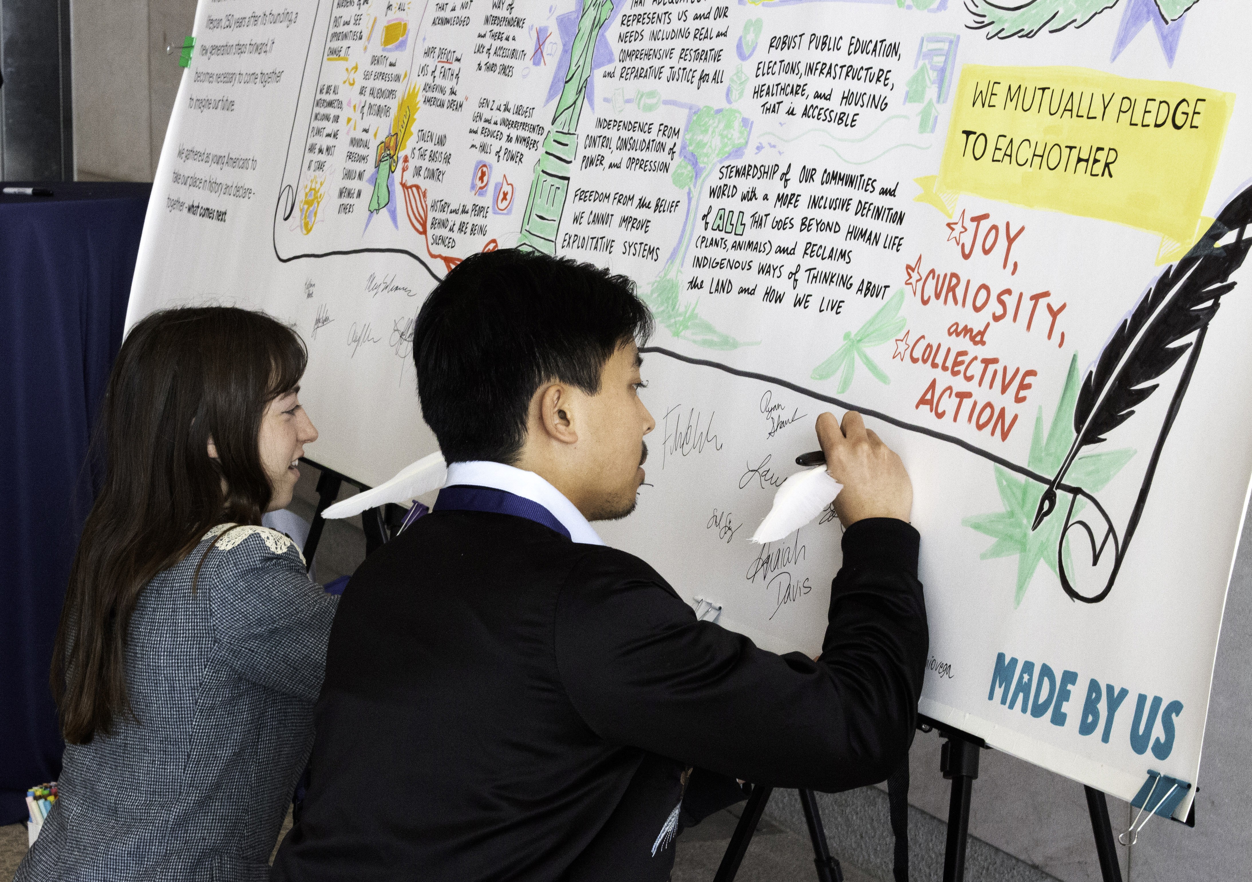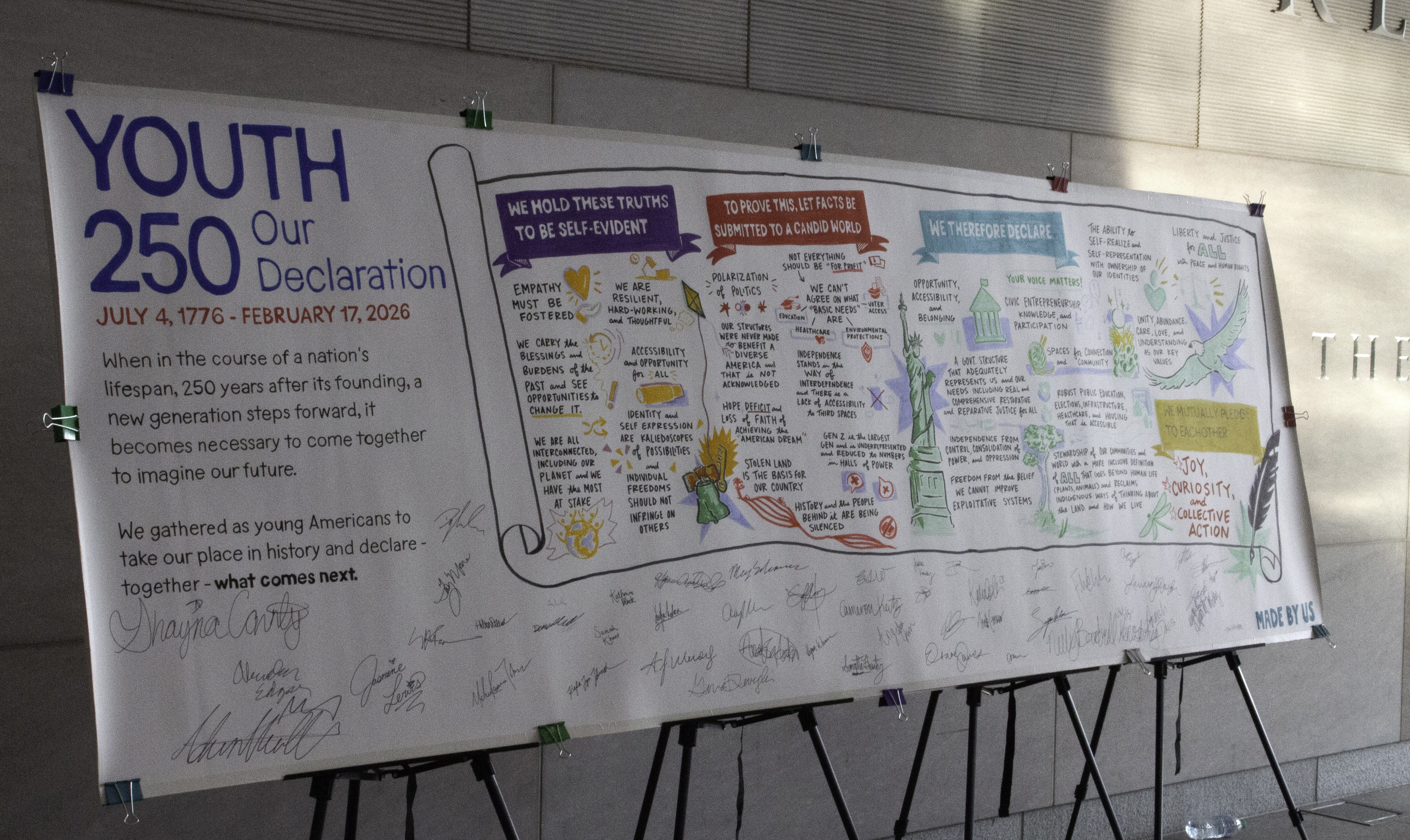 Through facilitated workshops, intergenerational dialogue, and creative performance, participants reflected on what it means to inherit American democracy at a milestone anniversary. The day culminated in the signing of a large-scale Declaration scroll, visualized live. The physical document will now travel to museums and institutions nationwide, amplifying youth voices in the months leading to July 4, 2026.