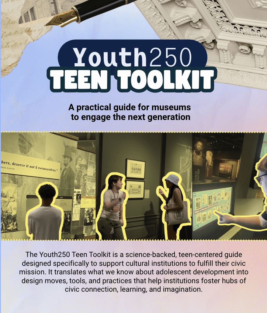 Similarly to the multi-dimensional nature of adolescent thriving, young adults are inhabiting a complex ecosystem and a unique stage of life. Our work shows that young people are asking four key questions when it comes to participating in civic life: Is this for me? Who else will be there? Do I know enough? Why should I care? View the full workbook or bring elements back to your organization to help you plan to serve Gen Z at the U.S. 250th - and beyond.